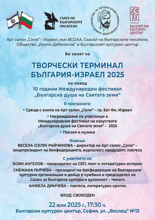 За 22 юли т.г. в София е насрочено събитие, наречено „Творчески терминал България-Израел 2025“. То се организира по повод 10 години Международен фестивал „Българска душа на Святата земя“.