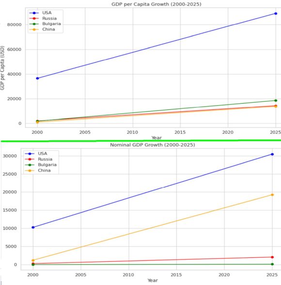 Следващите графики показват ръста на БВП на глава от населението, както и на номиналния БВП от 2000 до 2025 г. за САЩ, Русия, България и Китай.