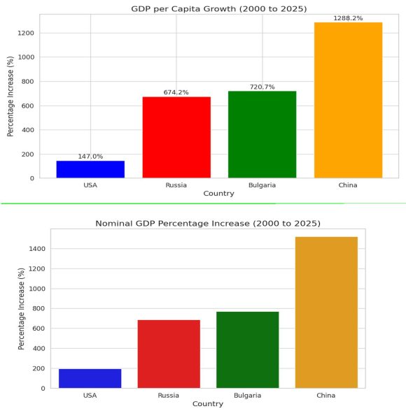 Следва графика с ръста в % на БВП на глава от населението от 2000 до 2025 г., за САЩ, Русия, България и Китай, а под нея графиката с процентното увеличение на номиналния БВП.