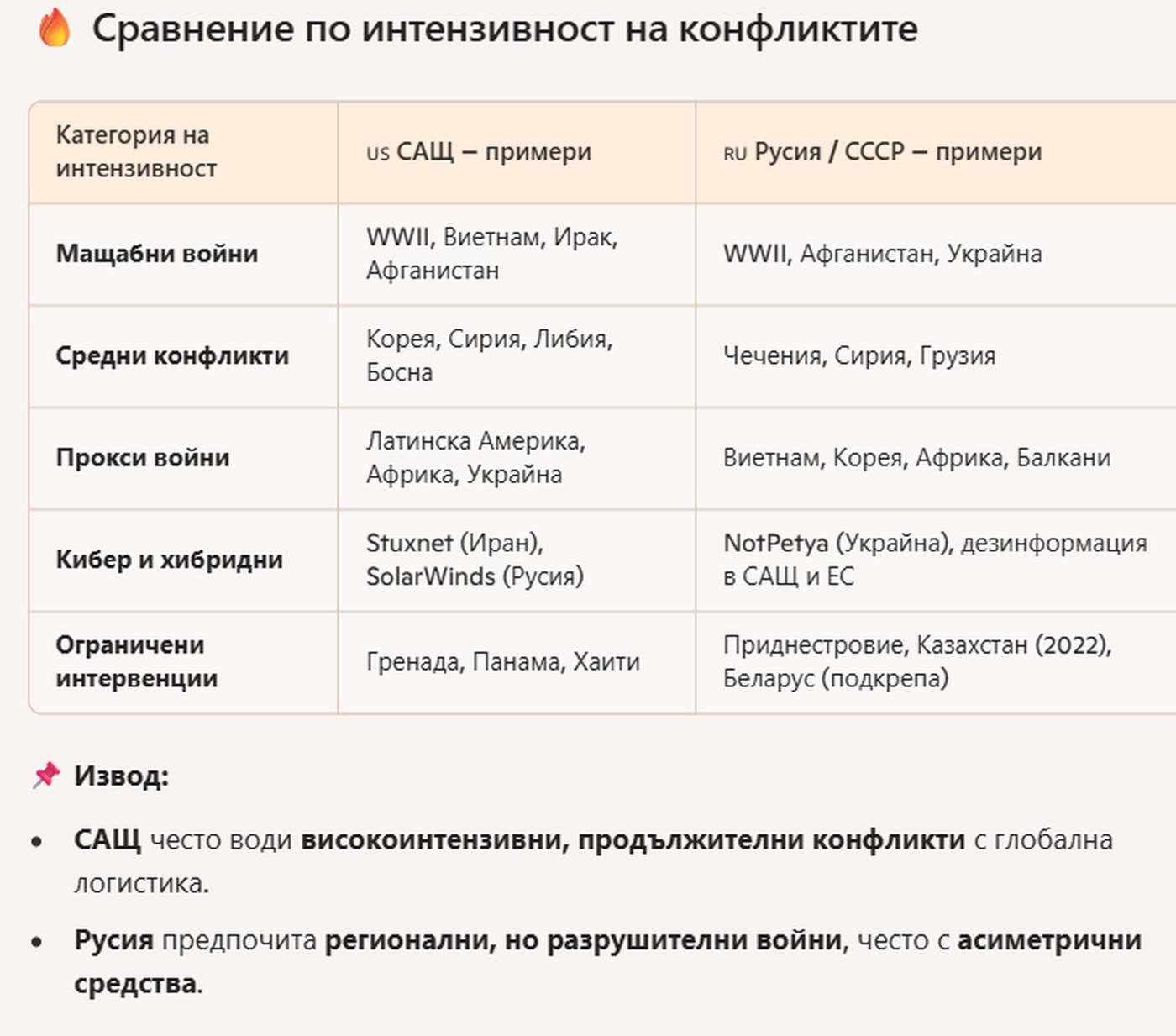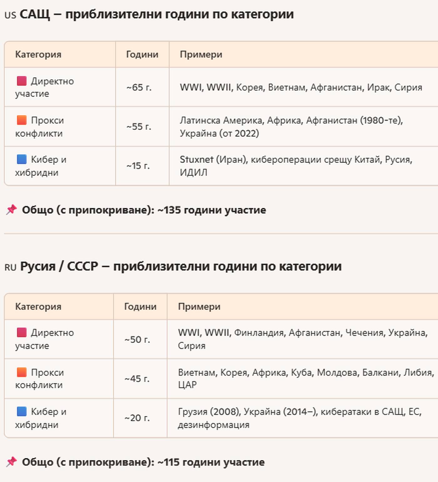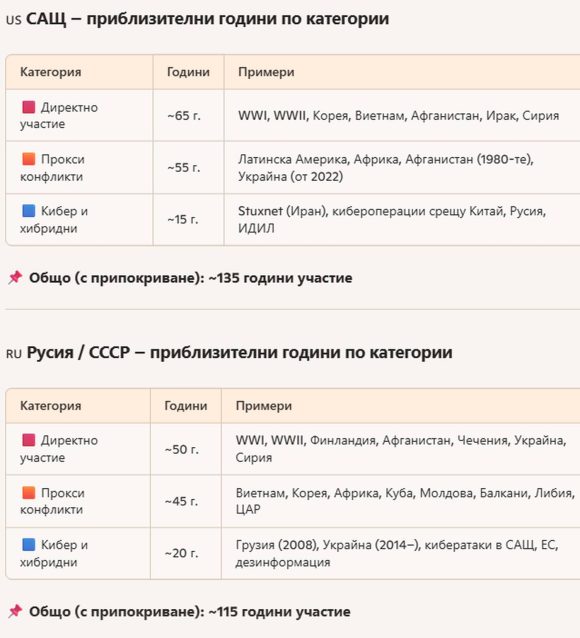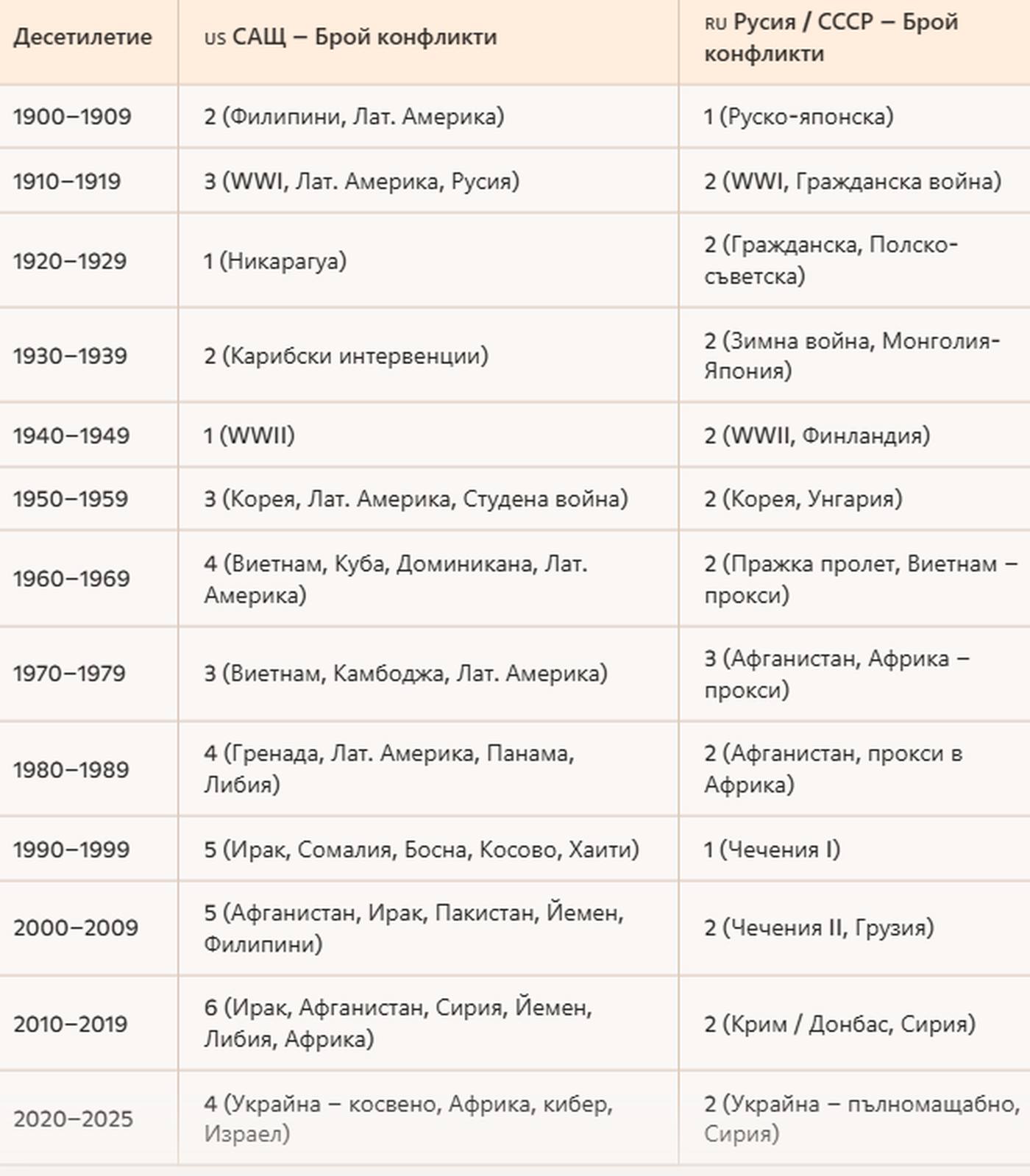 Общ брой конфликти (от таблицата): САЩ – 49 конфликта (с продължителност от 85 години ~или 68% от времето), Русия/СССР – 25 конфликта (65 години ~52%).