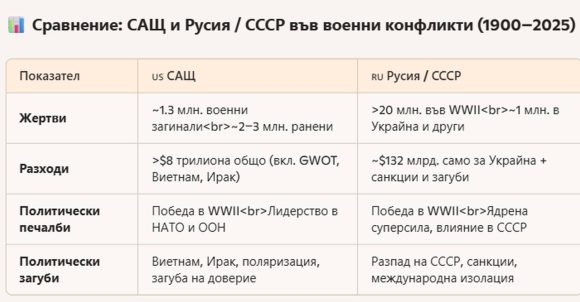 Русия/СССР имат по-малко на брой, но често по-интензивни и разрушителни войни (напр. Втората световна и Украйна).