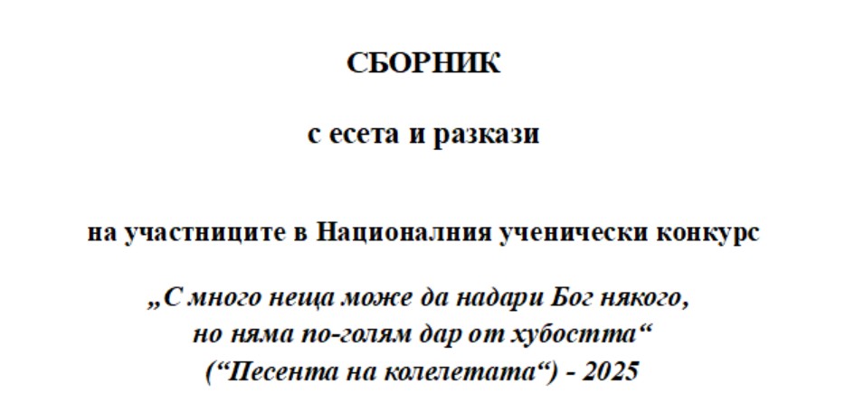 Сборникът с творбите от Националния ученически конкурс „С много неща може да надари Бог някого, но няма по-голям дар от хубостта“ („Песента на колелетата“) ще бъде без корична цена и ще се разпространява безплатно. Той е замислен като жест на подкрепа за всички деца и юноши – участници в конкурса и тяхното творческо развитие.