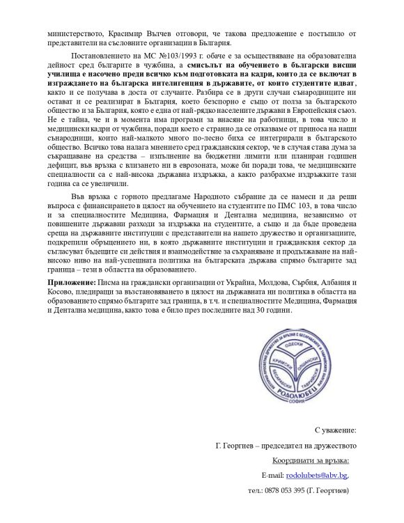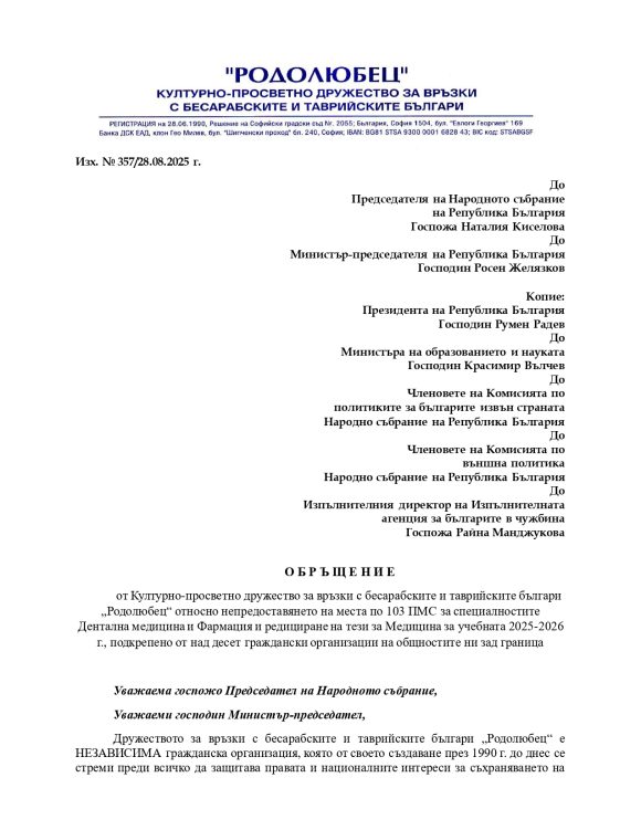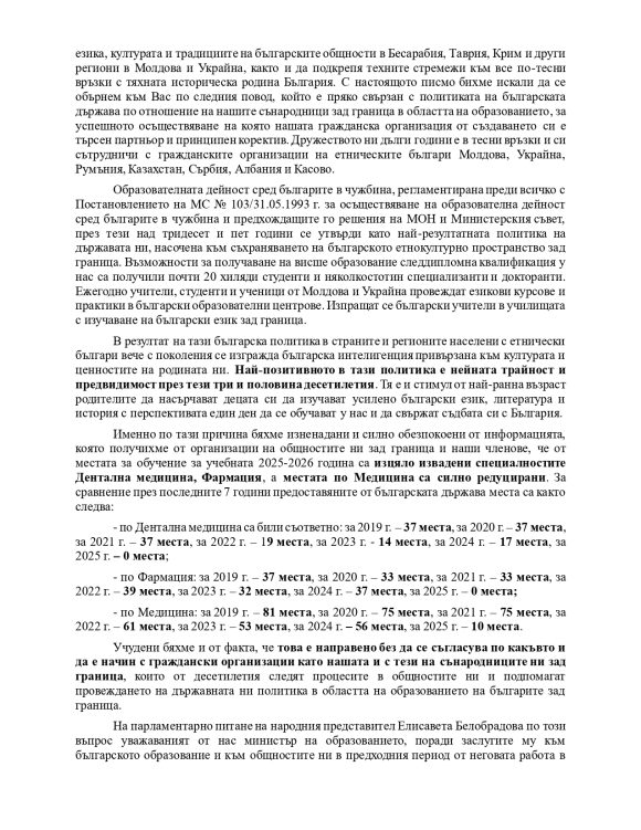 С тревога Ви информираме, че за учебната 2025–2026 година бяха изцяло премахнати местата по специалностите „Дентална медицина“ и „Фармация“, а тези по „Медицина“ бяха драстично редуцирани – от над 50 през предходни години на едва 10 сега. Това решение е взето без консултация с организациите на българите зад граница и противоречи на духа и целите на ПМС 103, което от над 30 години е основа на успешната българска политика за подкрепа на българските общности в чужбина чрез образование.