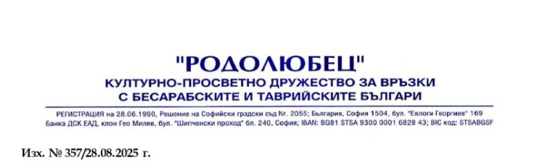 Културно-просветно дружество за връзки с бесарабските и таврийските българи „Родолюбец“ е изпратило на 28 август т.г. обръщение до председателя на Народното събрание и премиера на Р България, с копие до президента, министъра на образованието и науката, парламентарните комисии по политиките за българите в чужбина и по външна политика, изпълнителния директор на Агенцията за българите в чужбина.