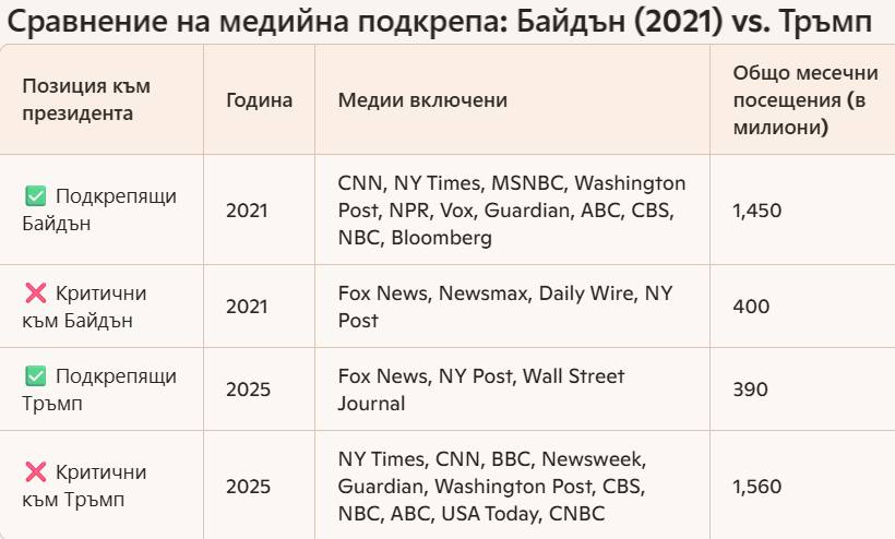Следва обобщена таблица, която сравнява приблизителния месечен брой посещения на водещи медии в САЩ, разделени по редакционна позиция спрямо Джо Байдън (през 2021 г.) и Доналд Тръмп (към днешна дата), като са изключени центристките и смесените медии: