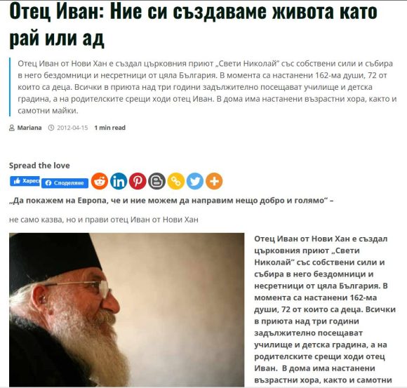 Починал е отец Иван, основател на приюта „Св. Николай“ при манастир „Св. Троица“ в Нови хан. Със своята неуморна грижа за хората, за които живееше, той остави светлина в сърцата ни. Вечна му памет!