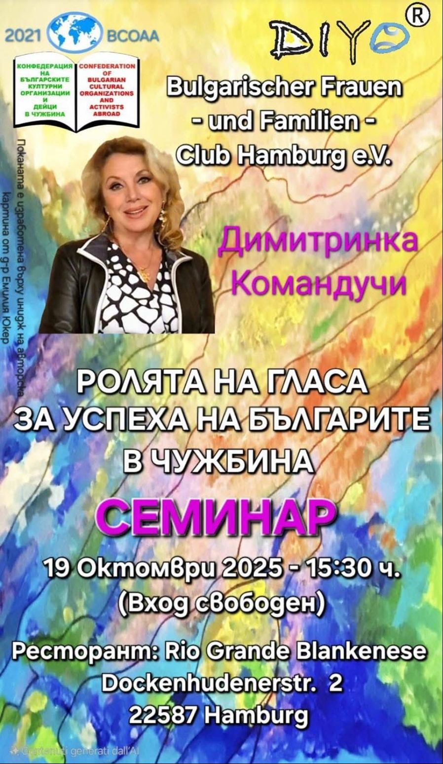 Културно дружество „Клуб на българските жени и семейства в Хамбург“ и Конфедерацията на българските културни организации и дейци в чужбина организират на 19 октомври т.г. в Хамбург семинар на тема „Ролята на гласа в общуването за успеха на българите в чужбина“. Следва поканата за събитието.