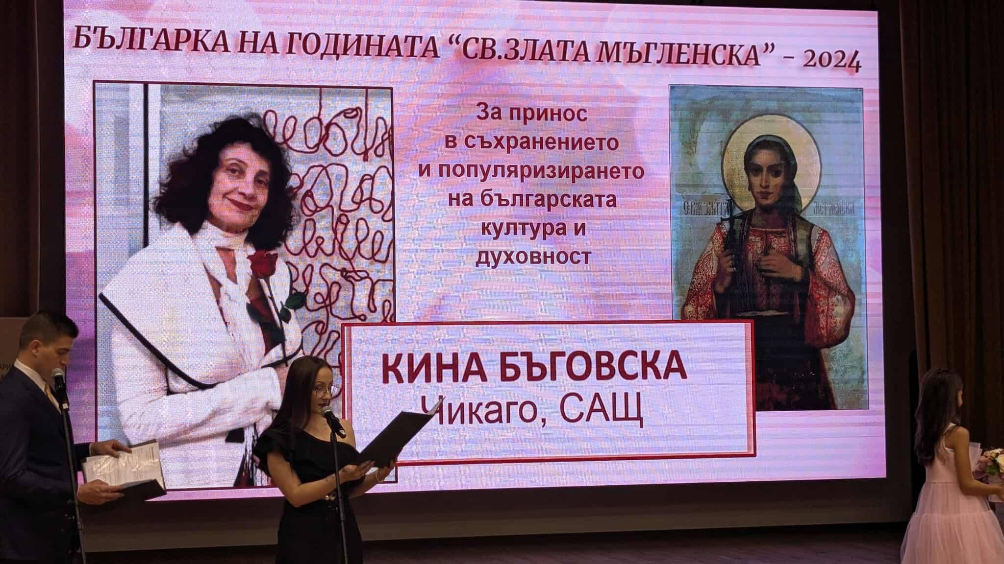 На 15 октомври 2024 г. в зала „Максима“ на Университета за национално и световно стопанство се проведе официалната церемония по връчване на наградата „Българка на годината – 2024“, учредена от Изпълнителната агенция за българите в чужбина. Отличието носи името на Св. Злата Мъгленска и се присъжда от 2009 г. насам на изявени българки зад граница, допринесли за съхраняването на националната идентичност, култура и достойнство.