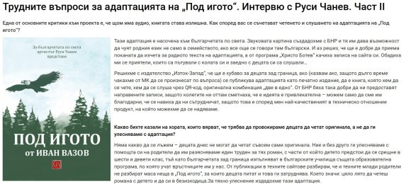 В интервю с него, поместено в сайта на издателство „Изток-Запад”, може да се запознаете защо и как се заел с тази отговорна задача. Учителите зад граница сме му благодарни. Има любопитни факти, които е добре да се знаят. Заглавието на интервюто в две части е Трудните въпроси за адаптацията на „Под игото” – вж. ТУК и ТУК.