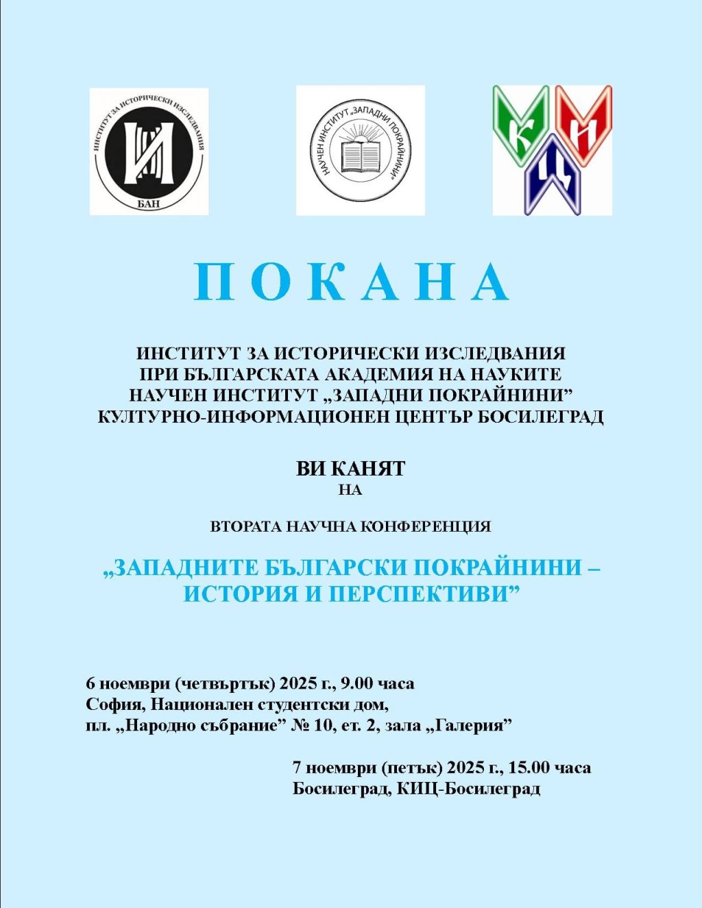 Институтът за исторически изследвания при Българската академия на науките, Научен институт „Западни покрайнини“ и Културно-информационен център „Босилеград“ организират двудневна научна конференция под название „Западните български покрайнини – история и перспективи“.