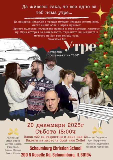 На 20 декември 2025 г. (събота), от 18:00 часа, в Шамбург, Schaumburg Christian School, ще бъде представена авторската постановка „УТРЕ“ на „3:16“.