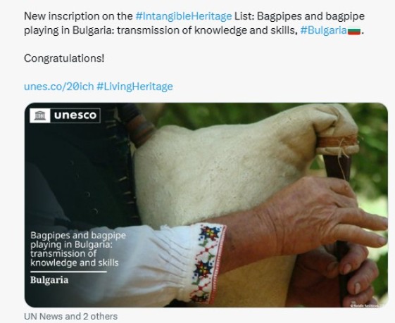 Признанието идва в резултат на усилията на България да подготви национална номинация за включване в представителния списък на ЮНЕСКО на нематериалното културно наследство на човечеството със следното досие: „Гайди и гайдарско свирене в България – предаване на знания и умения“.