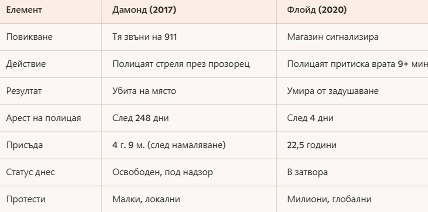 Двата случая показват драматична разлика в обществената реакция, скоростта на правосъдието и мащаба на последствията, въпреки че и двата са трагични убийства от полицаи в един и същ град. Това сравнение не цели да омаловажи нито един от случаите, а да покаже колко много фактори – политически и медийни – влияят върху това как обществото възприема и реагира на насилието.