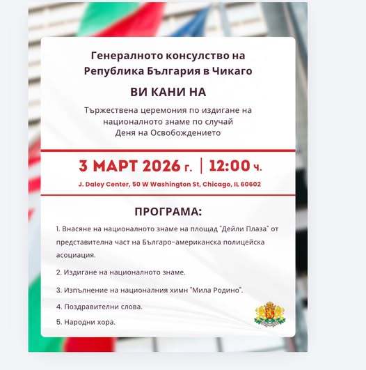 На 3 март, от 12:00 ч., Генералното консулство в Чикаго ще спази утвърдената традиция и ще организира церемония по издигане на националния флаг на Република България в сърцето на Чикаго по повод националния празник – Деня на Освобождението – информира Генералното консулство на своята ФБ страница.