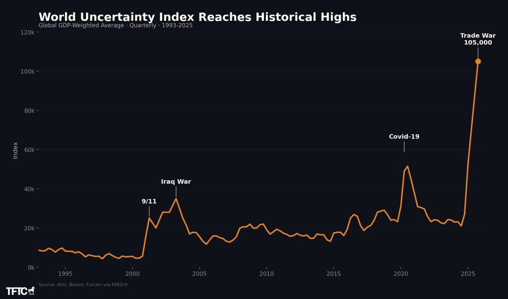Индексът на световната несигурност (WUI): С нива от 105,000 пункта, ние сме в непознати води. Това не е просто статистическа грешка, а отражение на тоталната непредсказуемост в търговските отношения между САЩ, Китай и ЕС. (вж. видео)
