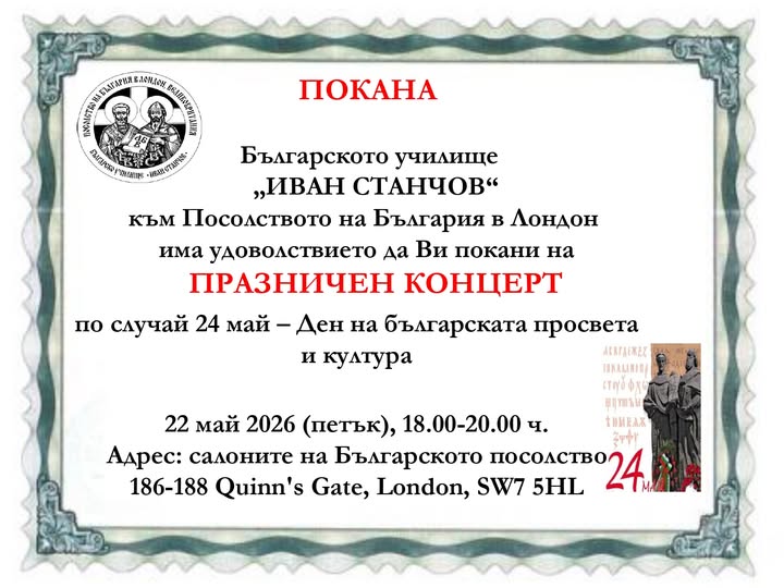 Във връзка със светлия празник на българската просвета и култура и на славянската писменост 24 май, Българско училище „Иван Станчов“ към Посолството на България в Лондон, Великобритания, ще изнесе празничен концерт.