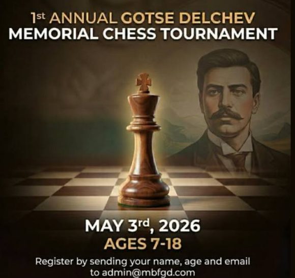 На 3 май 2026 г., от 12:00 до 17;00 ч., в Ролинг Медоус край Чикаго ще се проведе Първият годишен шахматен турнир „Гоце Делчев“. Инициативата е за приятелско състезание, което цели да събере на едно място младите таланти и любителите на играта, които ценят българското културно наследство.