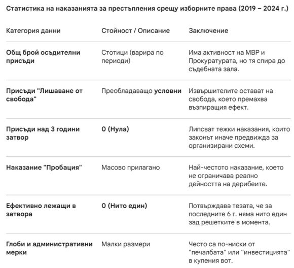 Ето какво писахме през 2024 година: « От получения файл с данни от ВСС се вижда, че няма наложени тежки наказания и осъдени над 3 години. От изнесеното по-горе, както и от други публикации се разбира, че от всички осъдени за купуване на гласове за последните 6 години, нито един в момента не е зад решетките. Което може да доведе до извода, че хората, които престъпват закона с деяния, свързани с купен вот и манипулиране на изборните резултати, едва ли се чувстват особено застрашени. И няма ефективна превенция на този вид престъпления.»