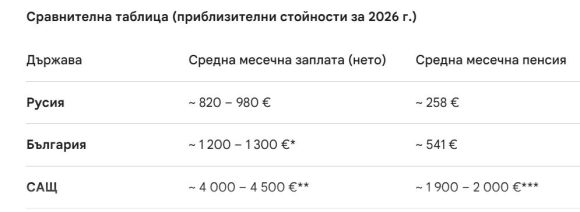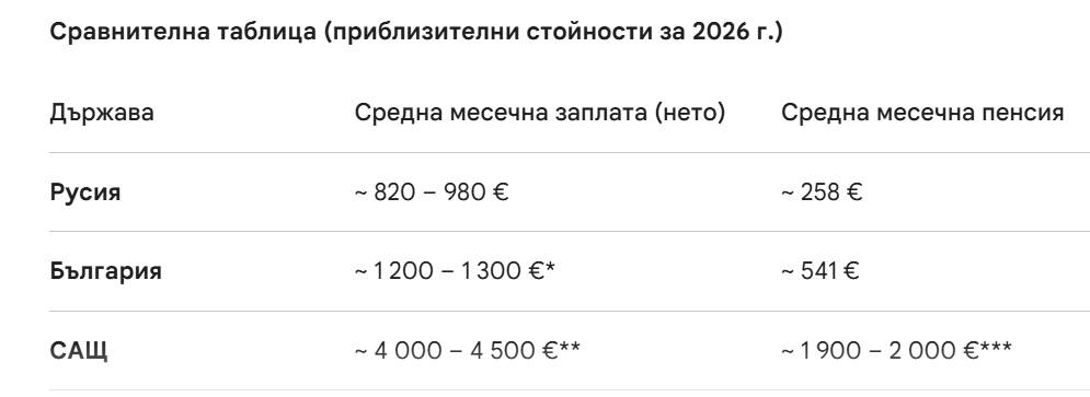 Средната заплата в Русия към началото на 2026 г. е 103 612 рубли (~ 987 евро). Важно е да се отбележи, че този „средноаритметичен“ показател често се изкривява от много високи доходи в специфични сектори. Медианната заплата е по-точен индикатор за дохода на средностатистическия работещ и е около 821 евро.
