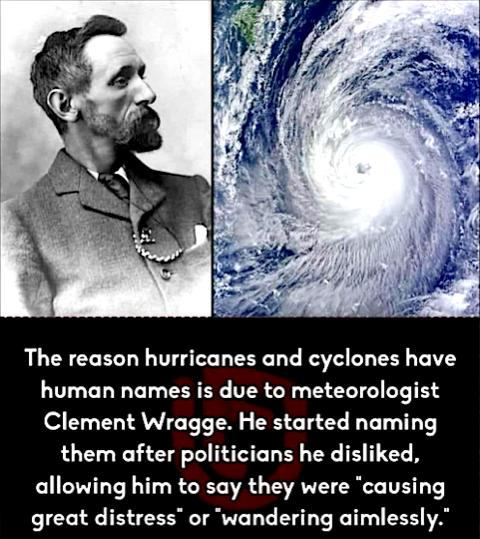 „Причината урагани и циклони да имат човешки имена се дължи на английския метеоролог Clement Wragge (1852–1922). Той започва да ги кръщава на имената на политици, които не харесва, позволявайки му да каже, че те причиняват „голямо бедствие“ или „безцелно учудване“.