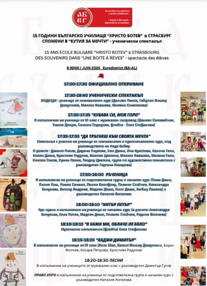 По повод годишнината, на 8 юни в Страсбург ще бъде изнесен празничен ученически спектакъл под надслов СПОМЕНИ...