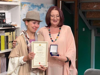 На снимката, вицепрезидентът на Българският културен център Теодора Минкова приема наградата за Мария Апостолова от зам.-изпълнителния директор...