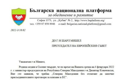 Българска национална платформа изпрати днес писмо до посолствата на Федерална република Германия в София и в Скопие,...